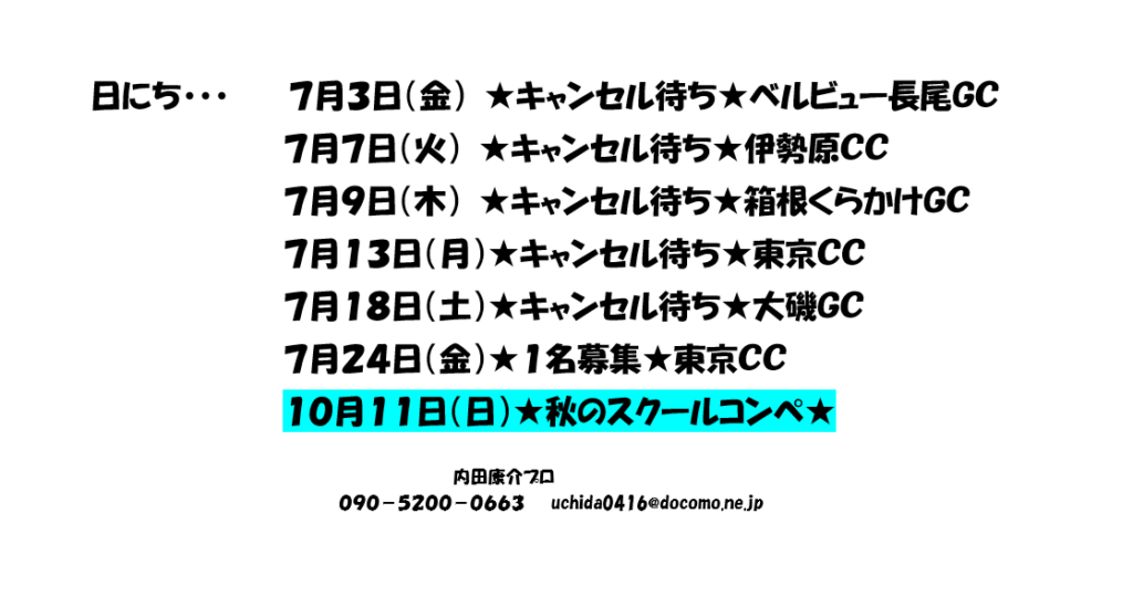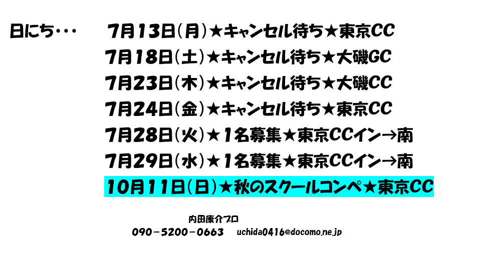 ps.10月11日㈰東京カントリークラブ南→インでコンペを行います。ただいま、10名エントリー(男性5名、女性5名)
